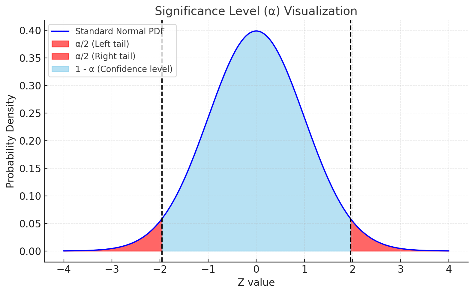 표준정규분포 \(\mathcal{N}(0,1)\)에서 양쪽 꼬리 부분의 확률이 \(\alpha/2\)가 되도록 하는 임계값이다.
