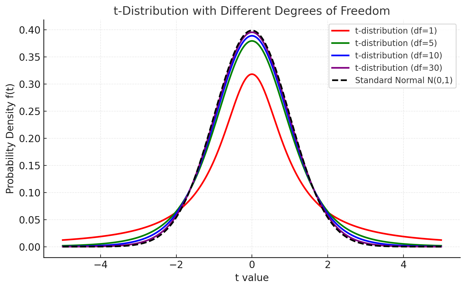 표본이 커질수록 \(t\) 값은 \(z\) 값에 가까워져, 결국 두 값은 동일하게 수렴한다.