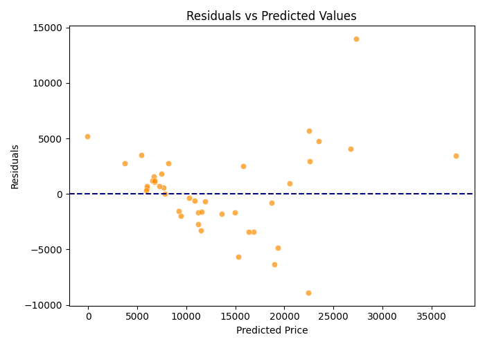 일부 고가 차량에서 예측 오차가 커지는 이분산성(Heteroscedasticity) 징후가 관찰된다. 고가 차량일수록 모델이 가격 변동을 완전히 설명하지 못하고 있음을 시사한다.
