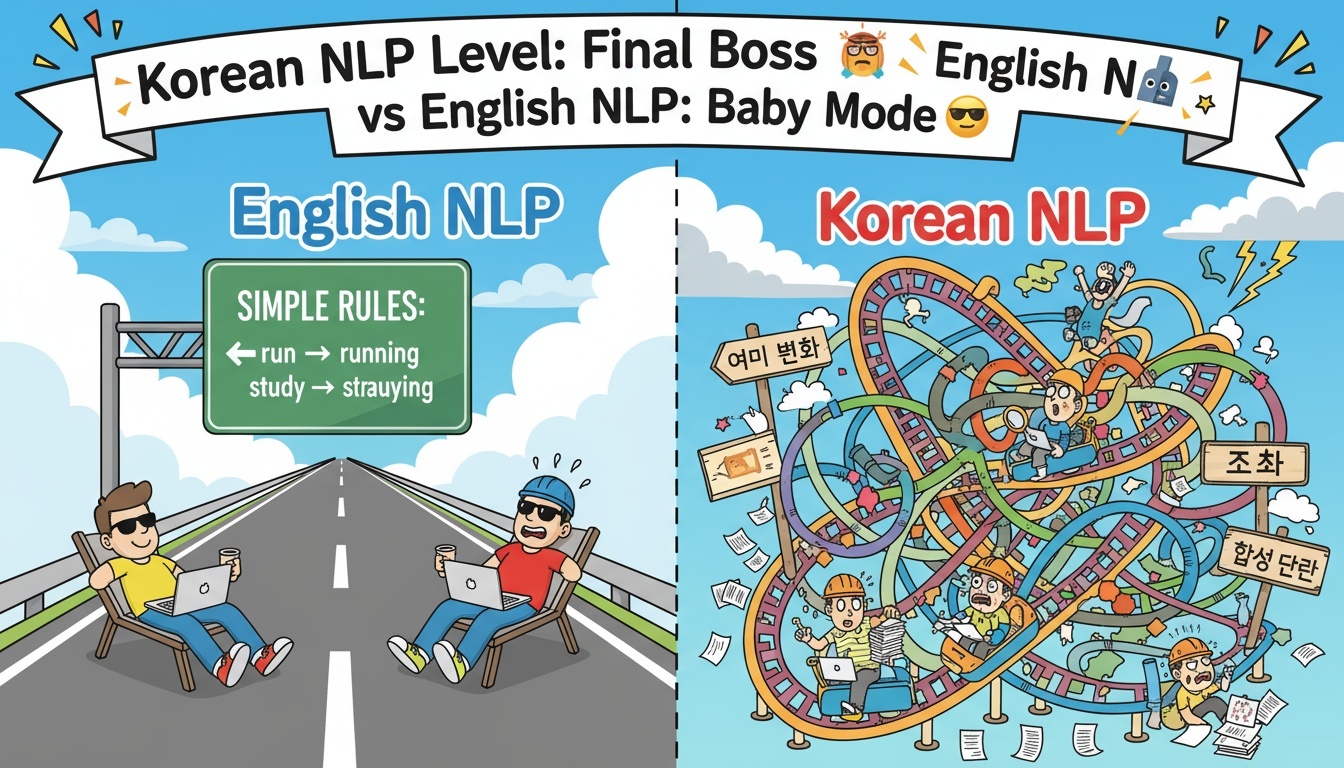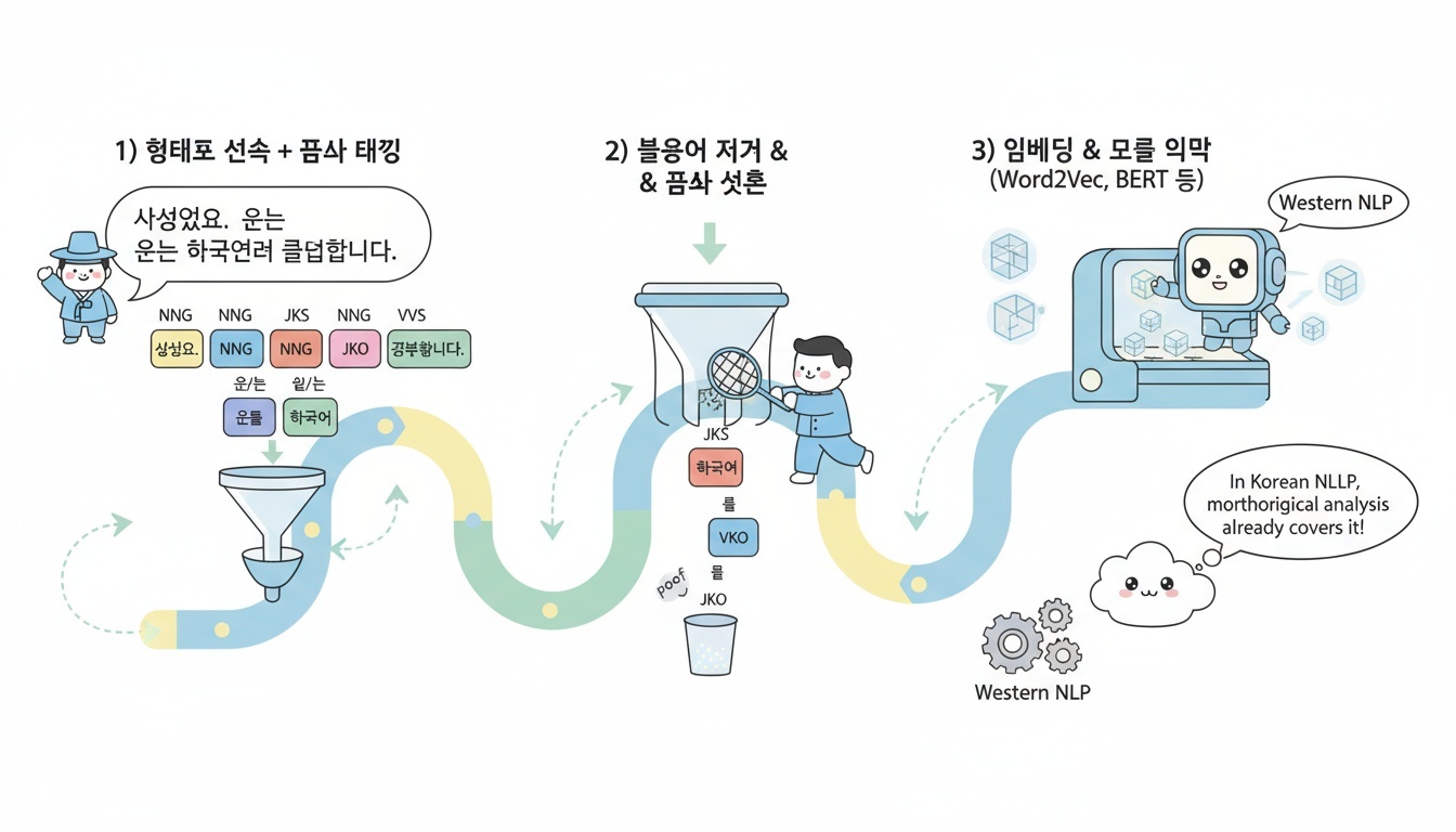 영어와 달리 한국어는 조사, 어미, 복합명사가 많기 때문에 단순한 공백 기준으로는 단어를 나누기 어렵다. 따라서 한국어 문장을 분석할 때는 전용 형태소 분석기를 사용한다.